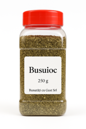 Busuioc uscat  – una dintre cele mai apreciate plante aromatice din bucătăria mediteraneană, recunoscută pentru aroma sa intensă, ușor dulceagă și proaspătă. Obținut din frunze atent selecționate și uscate natural, acest condiment păstrează parfumul specific busuiocului proaspăt și oferă preparatelor un gust echilibrat și rafinat.
