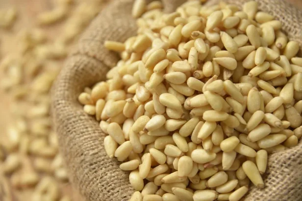 Mugurii de pin sunt deosebit de bogați în acizi grași mono-nesaturați, cum ar fi acidul oleic care ajută la scăderea LDL sau “colesterolul rău” și crește HDL sau “colesterolul bun” în sânge. De asemenea, o sursă excelentă de vitamina E găsim în acești muguri de pin, aproximativ 9,33 mg pe 100 g. Vitamina E este un antioxidant puternic, necesar pentru menținerea integrității membranei celulare a mucoasei și a pielii, protejându-o de radicalii liberi. În plus, mugurii de pin sunt una dintre fructele cu coajă lemnoasă fără gluten și, prin urmare, sunt un ingredient popular în prepararea de formule de alimente fără gluten.