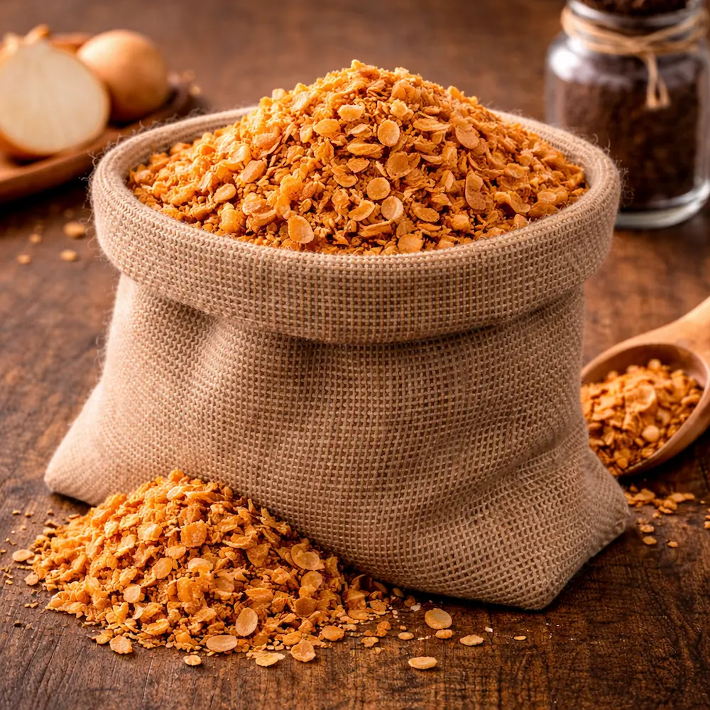 Ceapă fulgi prăjită este un topping crocant și aromat, ideal pentru salate, burgeri, supe și diverse preparate culinare.