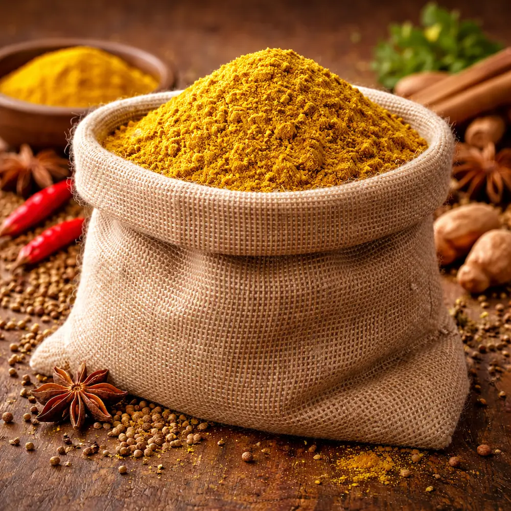 Compoziția poate include turmeric, coriandru, chimion, ghimbir, piper și boia. Aceste mirodenii se completează armonios și oferă un gust bogat și echilibrat.