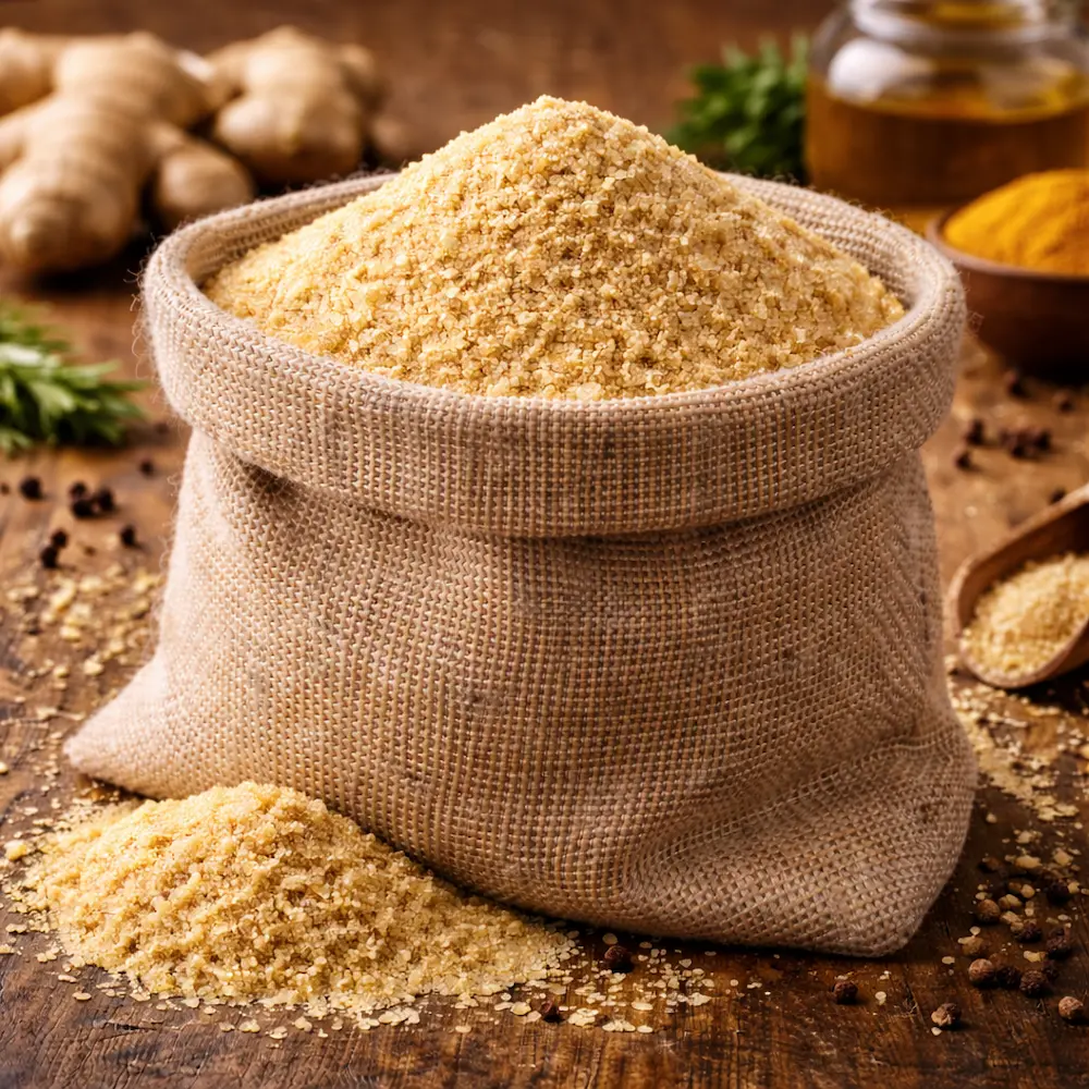 Ghimbir măcinat este un condiment aromat cu gust ușor picant, ideal pentru deserturi, supe, sosuri, carne și băuturi aromate.